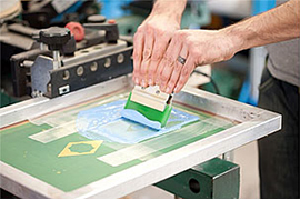 L’encre est répartie uniformément sur l’écran à l’aide d’une raclette, puis pressée à travers les zones ouvertes.
